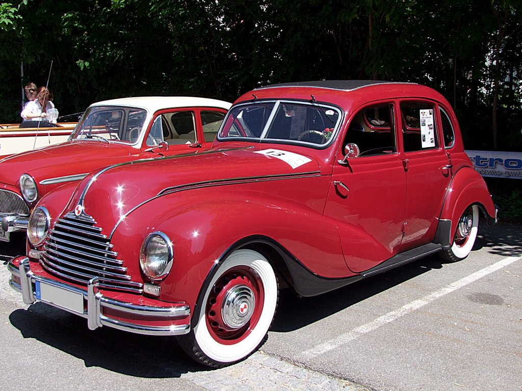 EMW 340-2, gebaut von 1952 bis 1955. Dieses Fahrzeugmodell war eine Ableitung des Vorkriegs BMW 326 und wurde in dieser Ausführung vom IFA-Werk Eisenach in Thüringen hergestellt. Ein solches Fahrzeug kostete bei seinem Erscheinen Ostmark 15.000,00. Im Arbeiter- und Bauernstaat liefen diese Autos fast ausschließlich in der Verwaltung und in der Industrie. Allerdings wurden auch ca. 19.000 Autos dieses Types exportiert. Angetrieben wird das Auto von einem Sechszylinderreihenmotor mit einem Hubraum von 1971 cm³ und einer Leistung von 55 PS. Central Garage Bad Homburg im Juni 2017.
