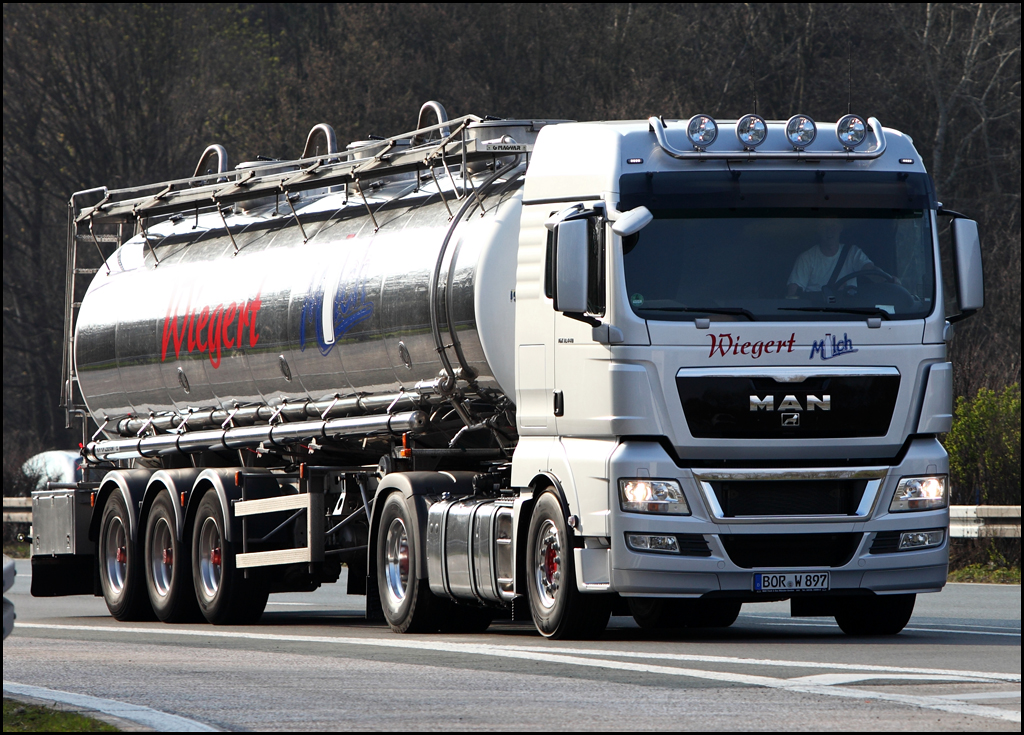 WIEGERT MILCH hat neue Fahrzeuge. Ein fabrikneuer MAN TGX 18.440XLX ist bei Lüdenscheid unterwegs. (19.04.2010)