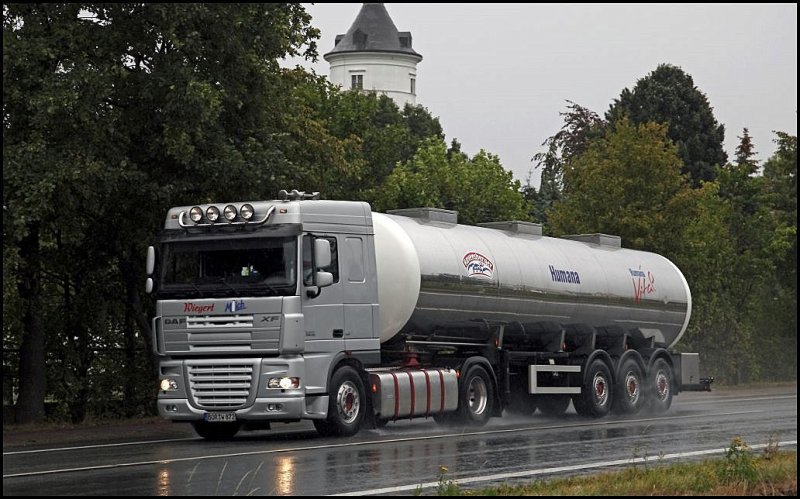 DAF XF105.410SC "SpaceCab" von WIEGERT MILCH mit einem Milchtankauflieger mit HUMANA Logos. Aufgenommen am 01.09.2009 in Warendorf.