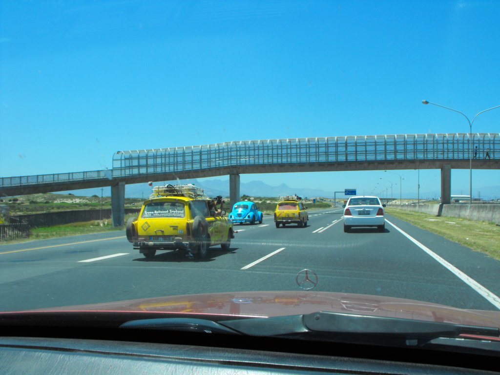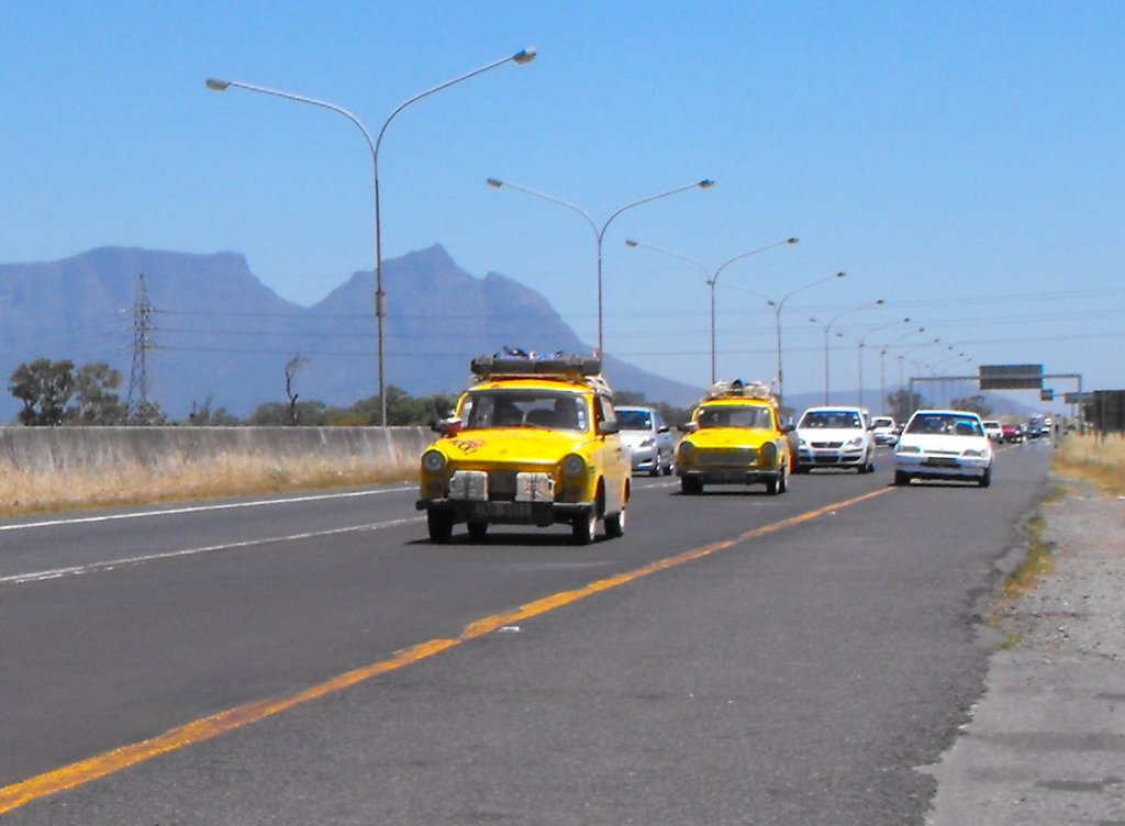Auf der Autobahn N2 von Kapstadt Richtung Grabow (Suedafrika), ueberholte ich zwei Trabbis mit tschechischen Nummernschildern, auf die ich dann auf dem Pannenstreifen gewartet habe um sie auf den Chip zu bannen. Was das mit ihrem Trip auf sich hatte, habe ich nicht herausgefunden. Die Beifahrer waren mit gegenseitigem filmen beschaftigt. Die Fahrzeuge waren bis unters Dach und auch darauf vollbepackt. 29.11.2009 Beat H. Schweizer