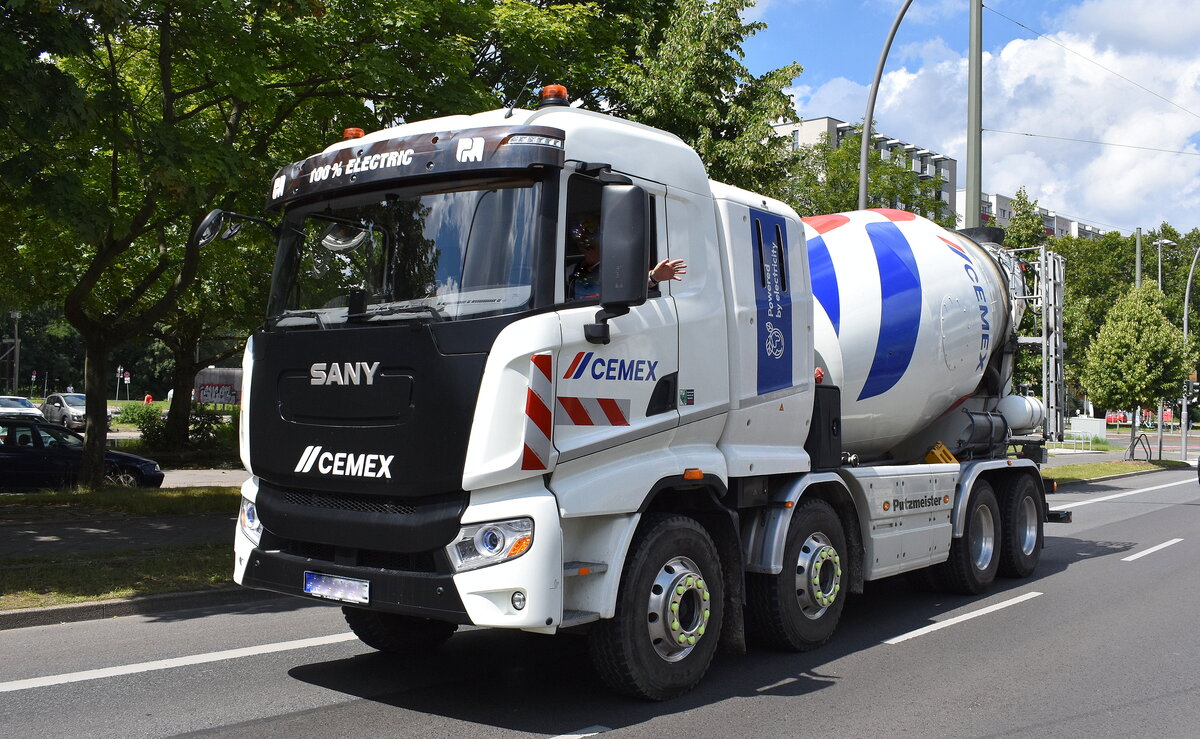 Das Baustoff-Unternehmen Cemex Deutschland hat in Berlin zwei Elektro-Betonmischer von Putzmeister in Betrieb, die Betonmischer basieren auf dem Chassis Sany 408P 8X4 der chinesischen Putzmeister-Konzernmutter Sany und verfügen über „einen P9G Fahrmischer-Aufbau komplett Made in Germany“. Das Modell fährt in 8×4-Achskonfiguration (mit zwei Lenkachsen vorne und zwei angetriebenen Hinterachsen) und mit einem zulässigen Gesamtgewicht von bis zu 34 Tonnen. An Bord in zehn Batteriepacks à 35 kWh gespeichert wird, die in einem separaten Gehäuse hinter dem Fahrerhaus untergebracht sind. Die Bordspannung beträgt 600 Volt. Bei Leerfahrt wird mit einer maximalen Reichweite von über 300 Kilometern, im Arbeitseinsatz wird real eher mit 150 Kilometer pro Tag gerechnet. Gesichtet am 11.07.24 Berlin Hohenschönhausen, Viele Grüße an den Fahrer: Lothar Stöckmann