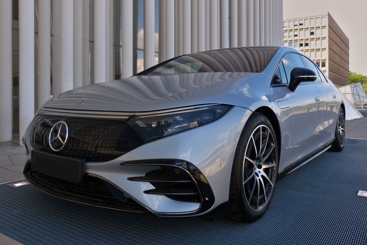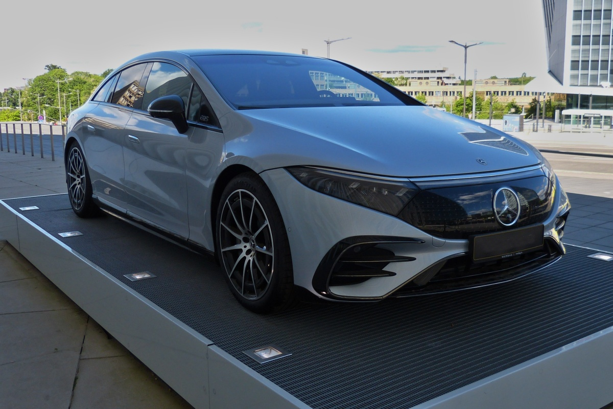 Heckansicht des Mercedes Benz EQS 450+, der auf einem Sockel vor der Philharmonie in der Stadt Luxemburg ausgestellt ist. 05.2022 De Rond Hans und Jeanny