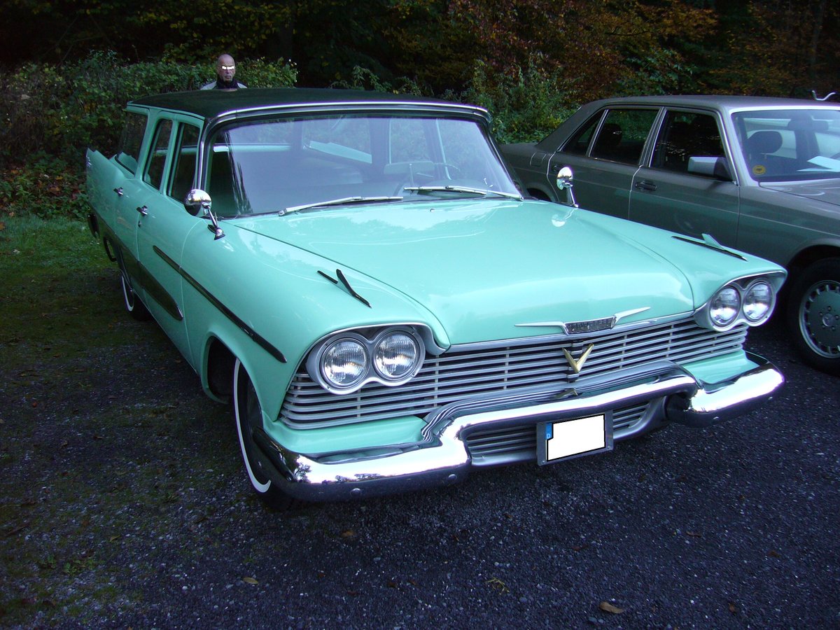 Plymouth Series LP2-L Custom Suburban aus dem Modelljahr 1958. Dieser Custom Surbuban (Kombi)basierte auf dem Modell Savoy des Jahres 1958 und war damit die mittlere Ausstattungsvariante. Darunter rangierte der Series LP2-L DeLuxe Suburban aus Basis des Basismodells Plaza und darüber LP2-H Sport Suburban Fury auf Basis des Topmodells Savoy. Ein solches, in den Farbtönen misty green/ivy green lackiertes Kombimodell war ab US$ 2712,00zu haben. Angetrieben wird das Kombimodell von einem V8-motor, der aus einem Hubraum von 5202 cm³ eine Leistung von 225 PS an die Hinterachse bringt. Oldtimertreffen "Schwarzwaldhaus" in Mettmann am 21.10.2018. Michael H.