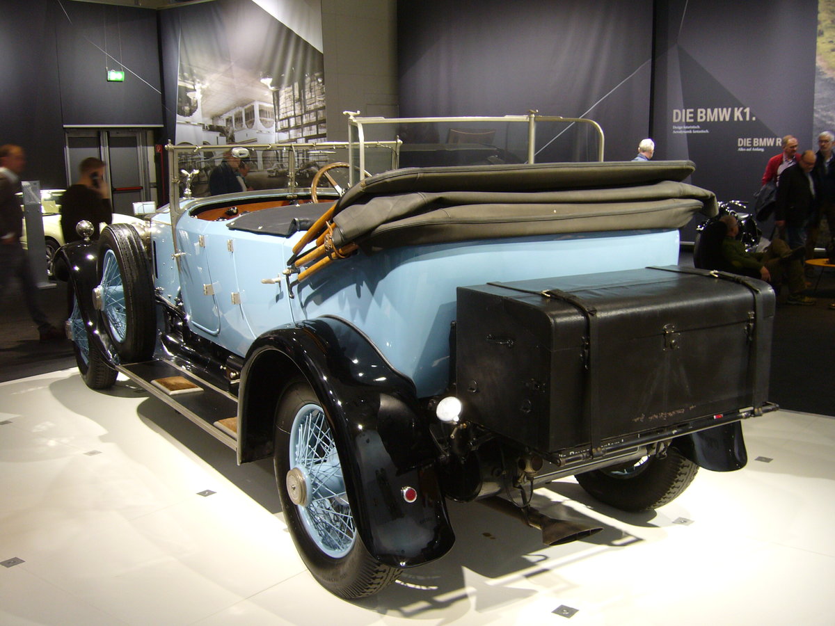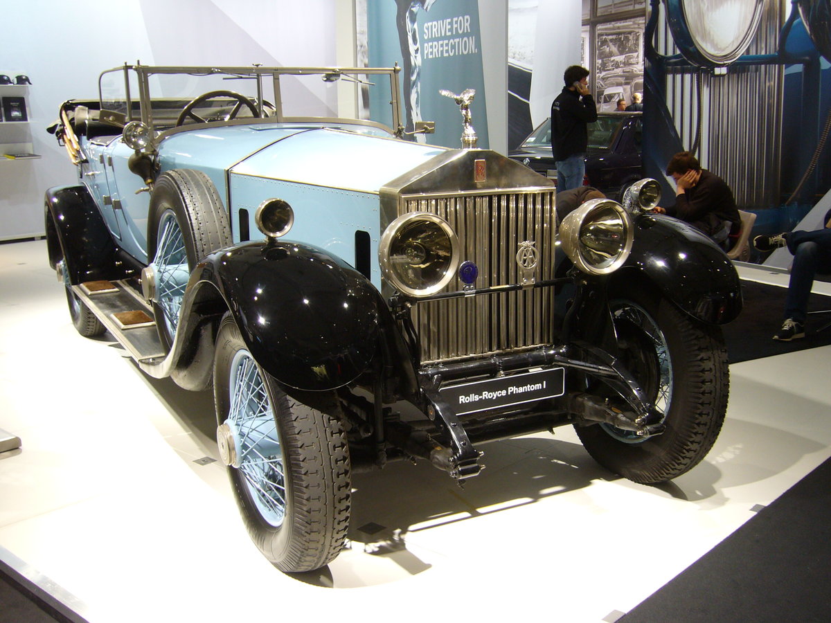 Rolls Royce Phantom I. 1925 - 1929. Der Phantom I war der Nachfolger des legendären  Silver Ghost . In der Regel lieferte Rolls Royce nur die Fahrgestelle an einen Karosseriebetrieb. Dort wurde dann der Aufbau nach Kundenwünschen vorgenommen. Der abgelichtete Phantom I wurde ursprünglich mit einer Landaulet-Karosserie von Rippon/Huddersfield-Yorkshire versehen. Im Zuge einer Restaurierung wurde dieser RR von 1929 mit einer Boat Tail Karosserie versehen. Der 6-Zylinderreihenmotor hat einen Hubraum von 7.668 cm³ Hubraum und leistet 100 PS. Classic Remise Düsseldorf am 10.01.2014.
