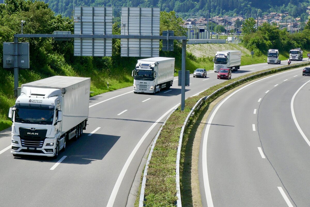 Ein MAN Sattelzug und weitere LKW vom Lagerhaus Lohn die am 28.6.24 unterwegs zum Trucker Festival sind am 28.6.24 auf der A8 in Matten b. Interlaken. Stefan H.