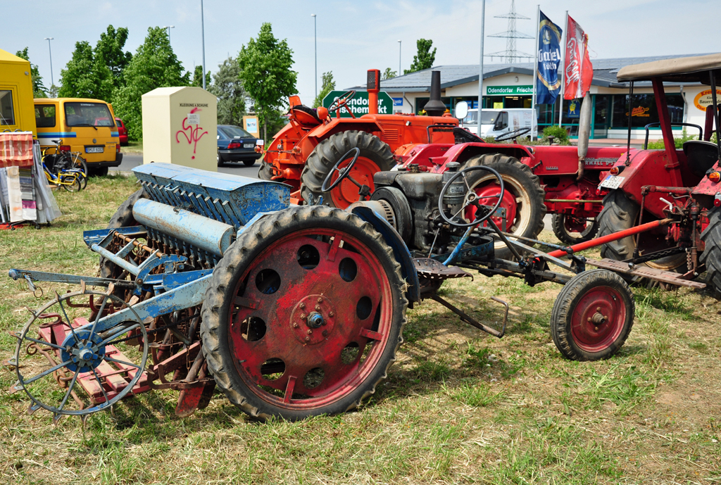das ist eine Drillmaschine zum Aussäen von körnigem Saatgut, rein mechanisch betrieben, der Vorgänger heutiger Hi-Tech-Maschinen, die mit Pneumatik und Elektronik jedes einzelne Korn zielgenau in den Boden bringen, da liegen so schätzungsweise 30-40 Jahre dazwischen.