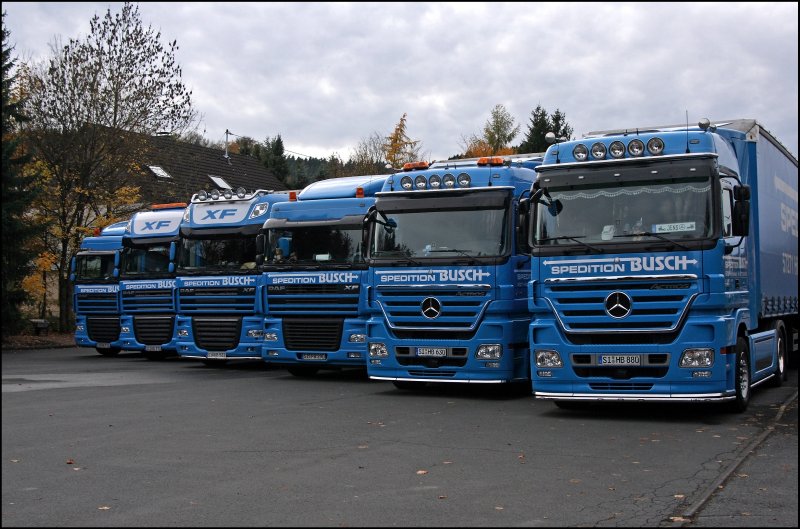 Heute habe ich mich kurzentschlossen mal ins Auto gesetzt und habe der Spedition BUSCH, einer meiner Lieblingsspeditionen, einen Besuch abgestattet. Dort angekommen konnte gleich ein Gruppenbild des Fuhrparks gemacht werden. Die Aufnahmen sind alle vom öfftenlich zugänglichen Berreich entstanden. (v.r.n.l.) Mercedes-Benz Actros 1848, Actros 1848, DAF XF95.480(?), 2x DAF XF105.510 und ein DAF XF105.460SC.
