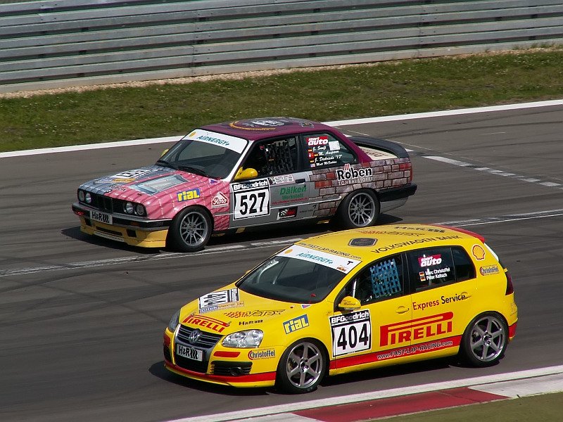 Spannende Duelle zu Hauf gibt es bei den VLN Rennen am Nürburgring. Hier duelliert sich gerade ein BMW mit einem Golf GTI...das Fotos zeigt die Anfahrt auf das Castrol-S und stammt vm 18.08.2007