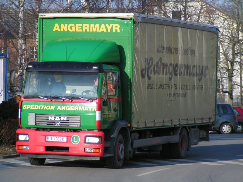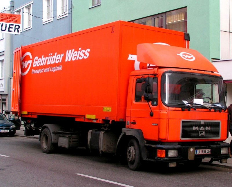 MAN(14.232)der Gebrüder Weiss mit "Bahnzugelassenem" Wechselaufbau bei der Zustellung in RIED i.I.071228
