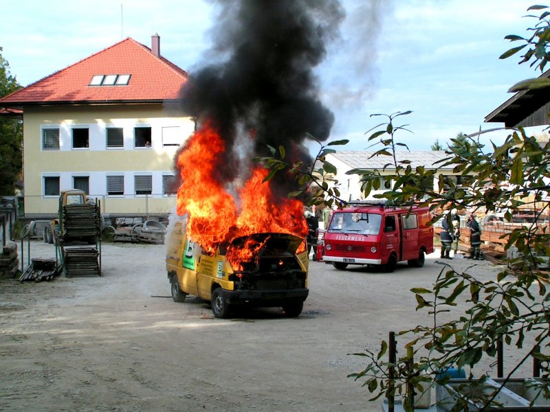 VW-Bus T4 steht im Vollbrand! Löschfahrzeug bereits eingetroffen; Gott sei Dank handelt es sich im gezeigten Fall um eine Feuerwehrübung; 071023