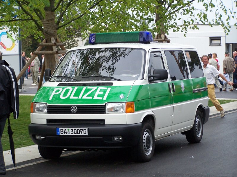 VW-Bus der IV. Bayerischen Bereitschaftspolizeiabteilung vor dem easyCredit-Stadion, welches zum Zeitpunkt der Aufnahme allerdings noch Frankenstadion hieß.