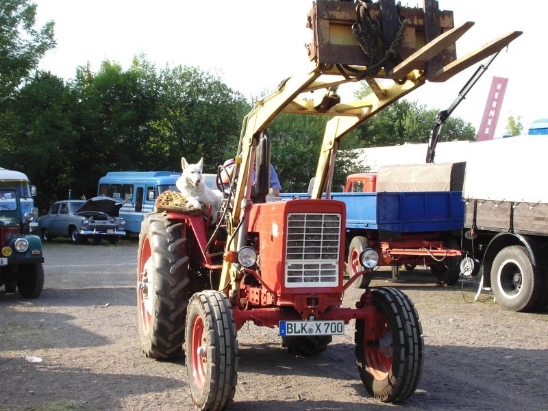 MTS 50 mit Hublader nd Tierischen Beifahrer auf dem ehem. AGRA Gelände Markleeberg beim Bulldogtreffen 2005