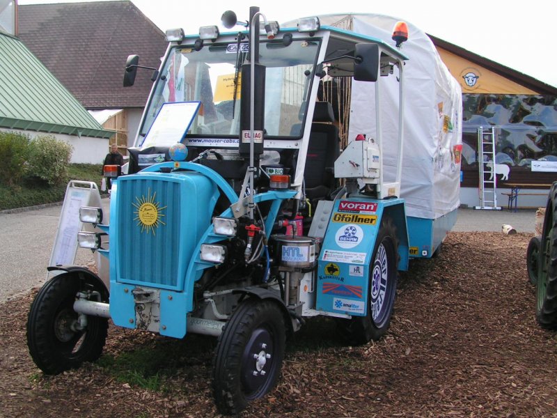 17 PS-Traktor (Marke Sonnenknecht Mauser, Baujahr 1957), mit einem Spezialanhänger, in welchem der benötigte "Biosprit" gepresst wird.