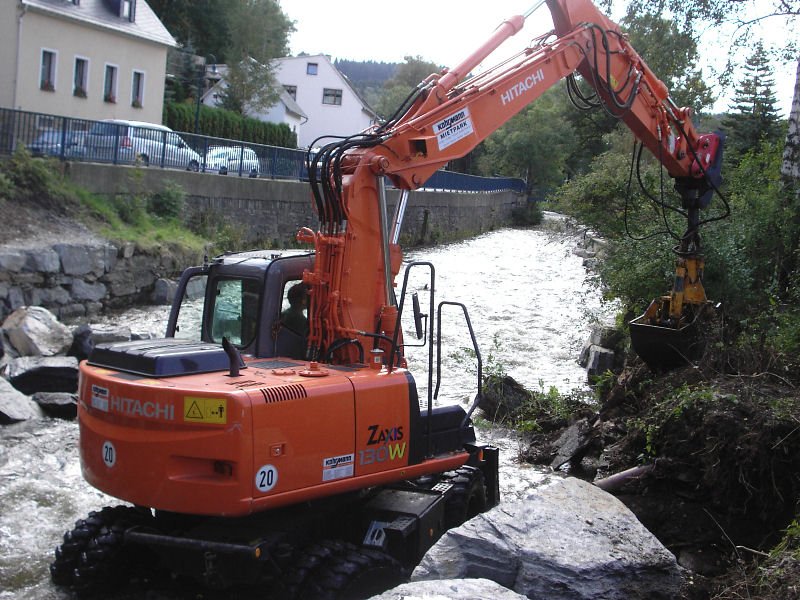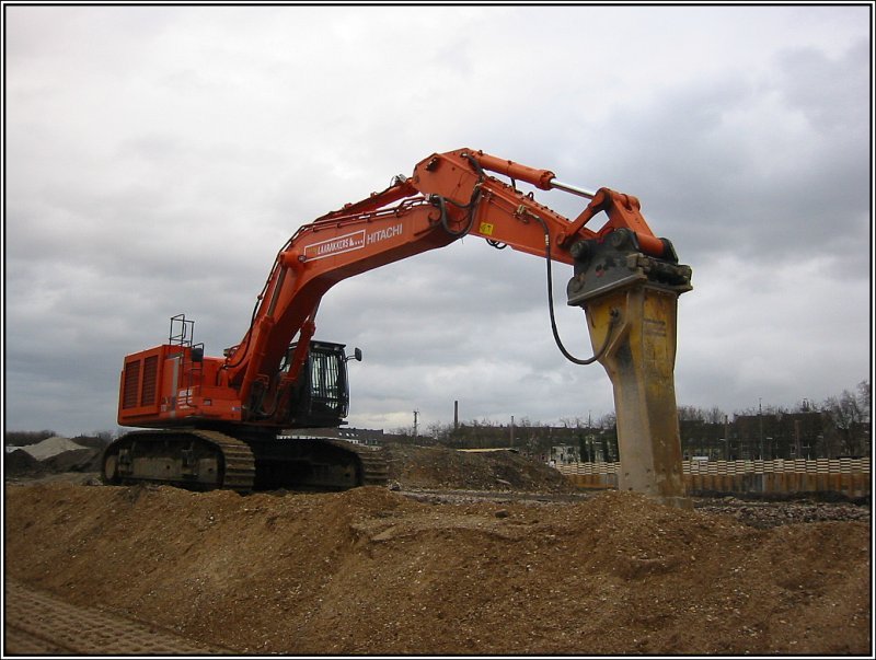 Großbaustelle in Düsseldorf: Neben dem S-Bahn-Haltepunkt Düsseldorf-Bilk wird auf einem ehemaligen Bahngelände ein großes Einkaufs- und Stadtteilzentrum (Projekt "Düsseldorf Arcaden") gebaut. Am 21.01.2007 war man noch dabei, das riesige Gelände frei zu räumen. Hier im Bild ein Hitachi-Bagger.