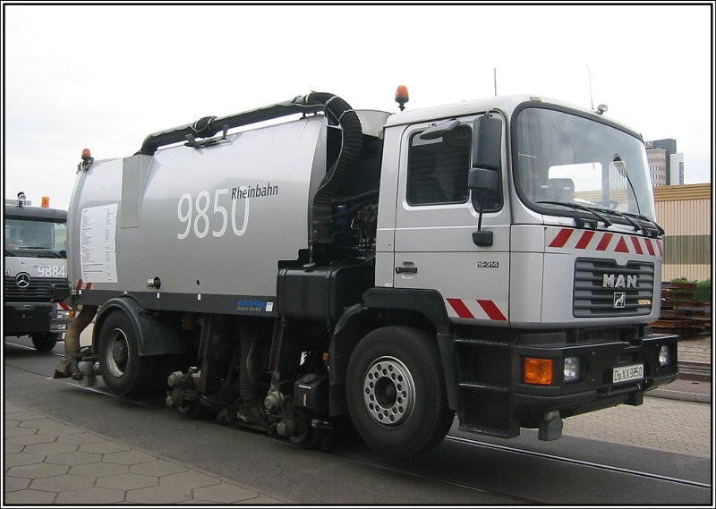 Während der Tage der offenen Tür im Betriebshof Heerdt der Düsseldorfer Rheinbahn am 12. und 13.05.2007 wurden auch einige Radfahrzeuge ausgestellt. Hier im Bild ein Zweiwege-fähiges Reinigungsfahrzeug auf Basis eines MAN-LKW. (13.05.2007)