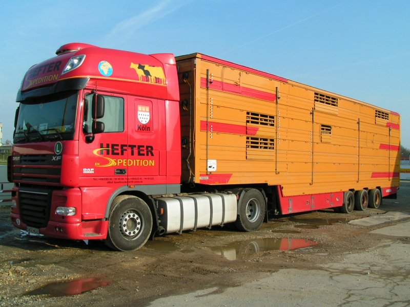 DAF XF, Tiertransporter in der Morgensonne am Messeglände von Ried i.I.; 080424