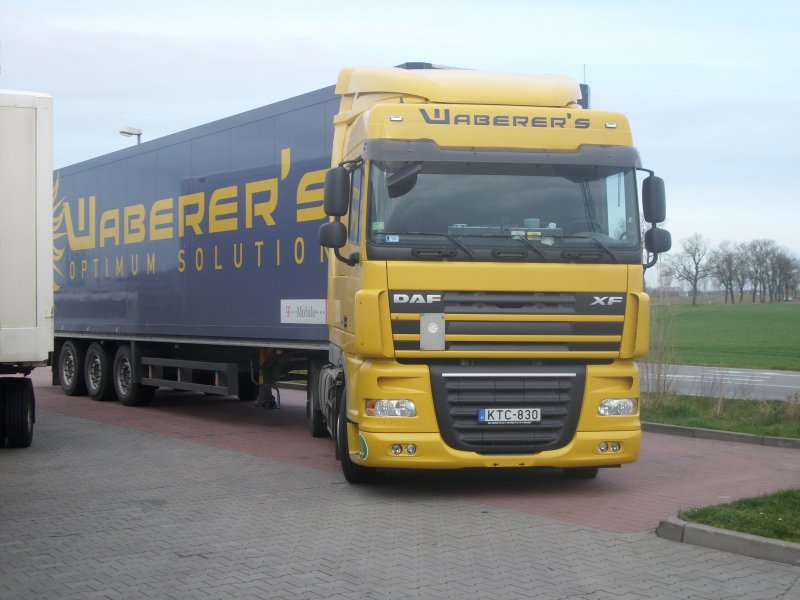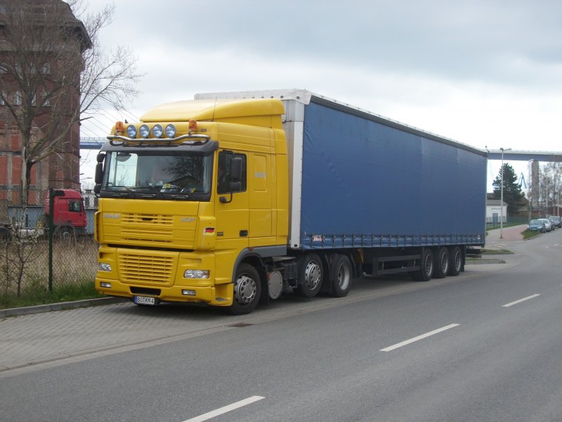 Ein ungarischer DAF-LKW diesmal nicht im Fährhafen Sassnitz-Mukran sondern am 16.04.2008 auf einem Parkplatz in Bergen/Rügen.