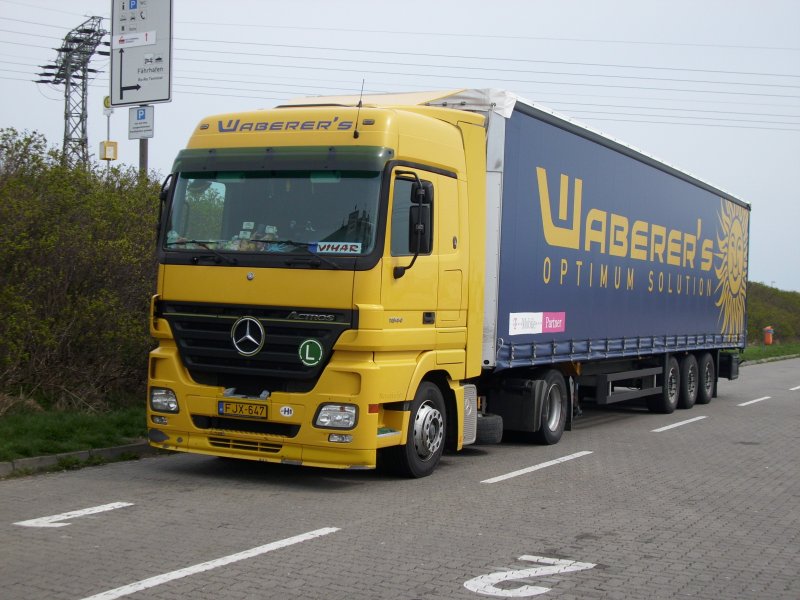 Ein ungarischer Mercedes-LKW am 14.04.2008 im Fährhafen Sassnitz-Mukran und wieder ist es die Spedition WABERER`S !