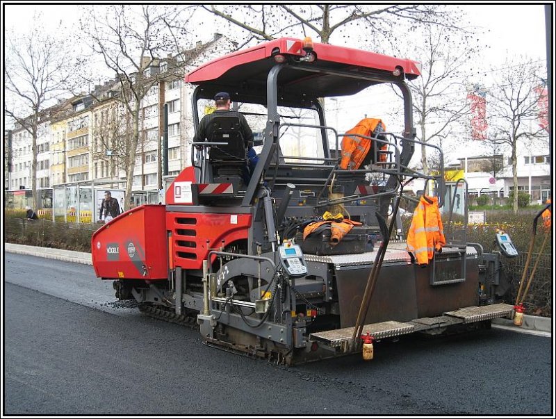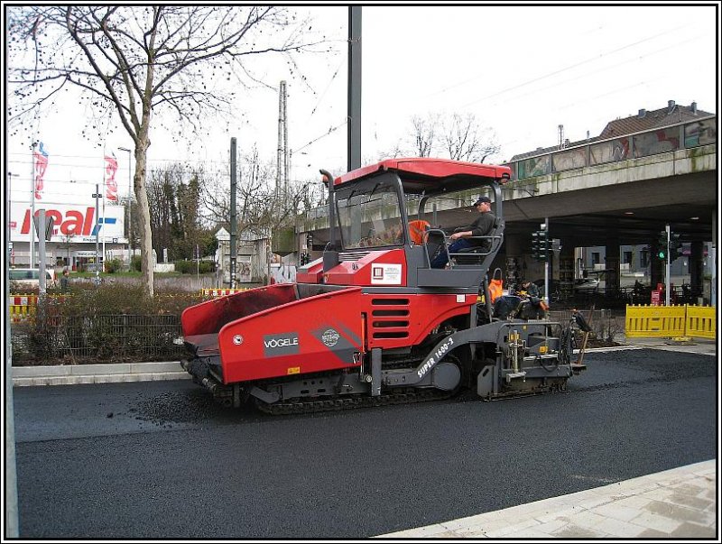 Ein VÖGELE-Asphaltfertiger bei Straßenbauarbeiten beim Düsseldorfer S-Bahn-Haltepunkt Bilk, aufgenommen am 02.03.2008.