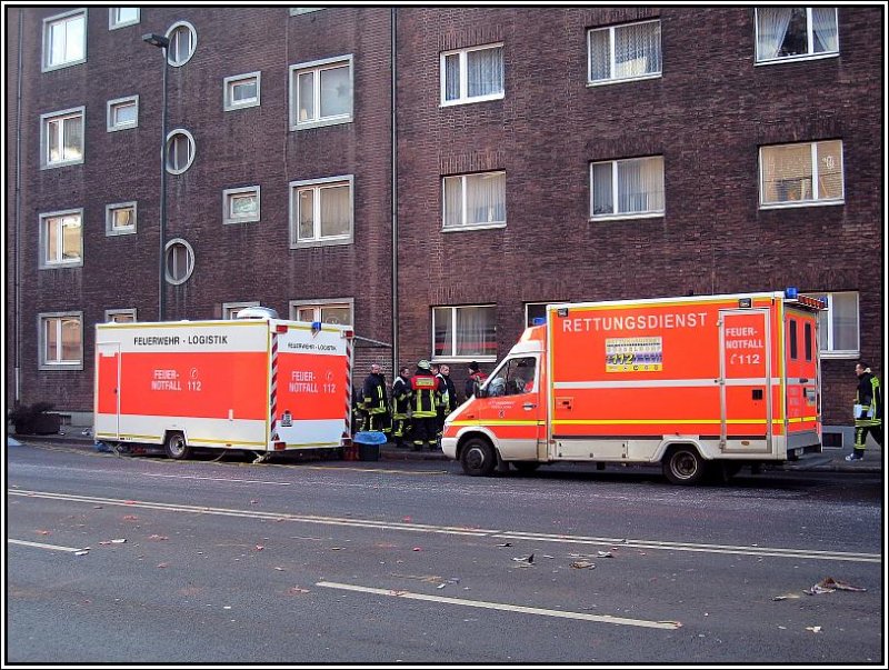 In der letzten Silvesternacht brannte im Düsseldorfer Stadtteil Bilk das Lager einer Papierfabrik nieder. Am frühen Nachmittag des 01.01.2008 war das Feuer längst erloschen, trotzdem standen noch zahlreiche Fahrzeuge der Düsseldorfer Feuerwehr am Brandort. Das Fahrzeug rechts ist ein Rettungswagen, der Anhänger links daneben diente der Verpflegung der Feuerwehrleute vor Ort.