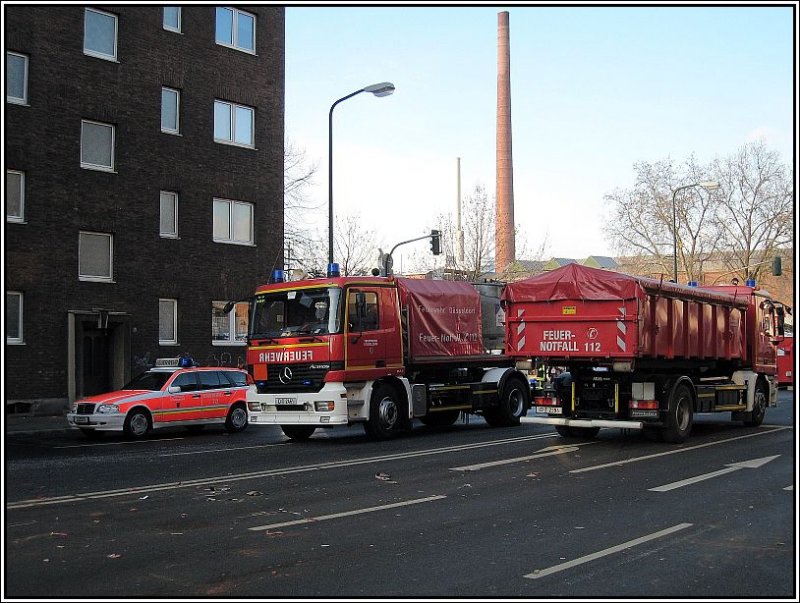 In der letzten Silvesternacht brannte im Düsseldorfer Stadtteil Bilk das Lager einer Papierfabrik nieder - woran das wohl gelegen haben mag? Am frühen Nachmittag des 01.01.2008 war das Feuer längst erloschen, trotzdem standen noch zahlreiche Fahrzeuge der Düsseldorfer Feuerwehr am Brandort, auch dieser Einsatzleitwagen links sowie die beiden anderen Fahrzeuge im Bild.