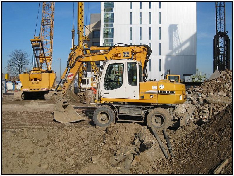 Liebherr-Bagger im Einsatz: Im Düsseldorfer Medienhafen wird ein neues Büro-Hochhaus ("Sign" von Murphy /Jahn) gebaut. Im Vordergrund ein Mobilbagger vom Typ 316 Litronic. Im Hintergrund stehen mächtige Seilbagger und ein Rammgerät. Die Aufnahme stammt vom 10.02.2008.