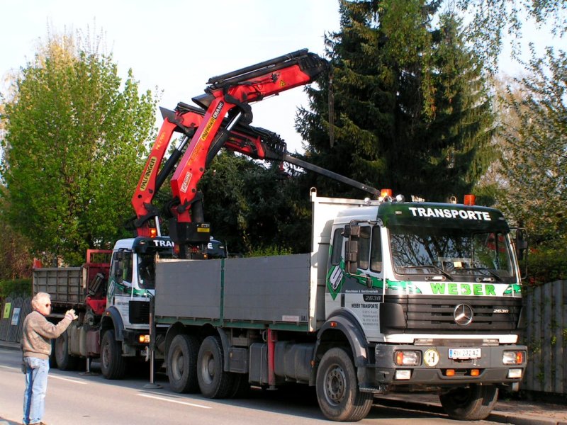 Mercedes 2638 und 2635 sind mit Kranarbeiten zugange (Baumfällen); 080424