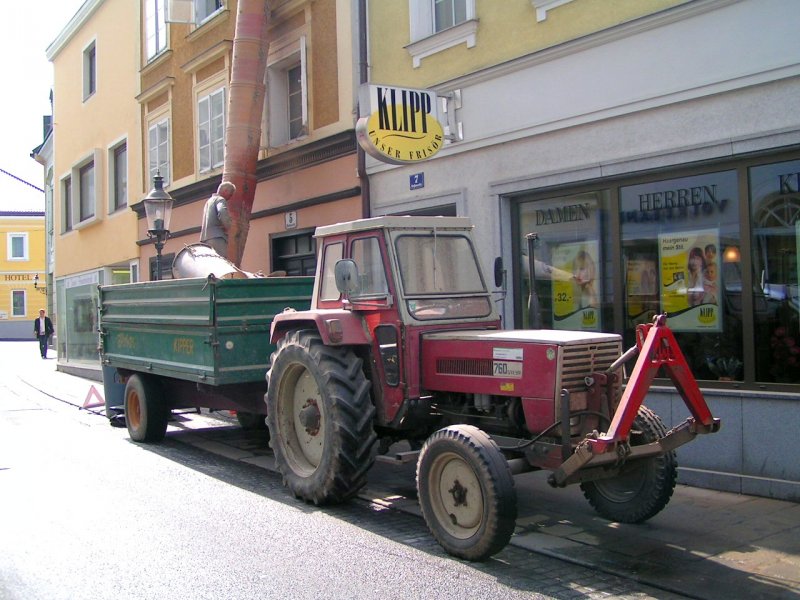 STEYR760 ist mit einem Einachsanhänger vorgefahren, und nimmt Bauschutt anlässlich einer Renovierung auf; 080423