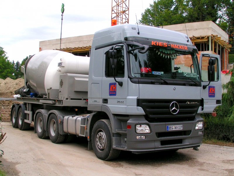 ACTROS2644 mit Betonmischauflieger einer Bayrischen Firma liefert Fertigbeton zu einer Baustelle in Ried i.I.; 080813