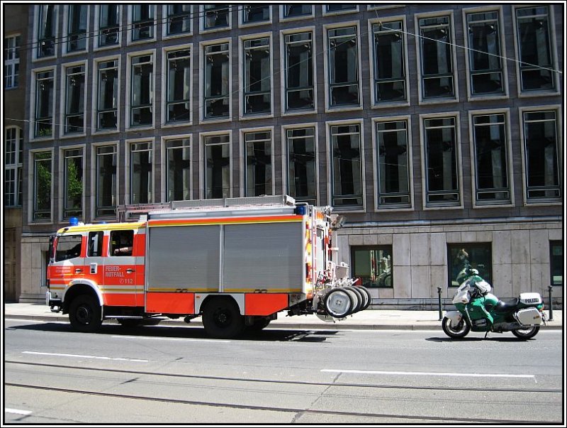 Am 10.05.2008 stand ein kompletter Löschzug der Düsseldorfer Berufsfeuerwehr im Düsseldorfer "Bankenviertel". Gebrannt hat da aber offenbar nichts, machte alles einen entspannten Eindruck. Hier im Bild ein Löschfahrzeug, dahinter noch ein Motorrad der Polizei.