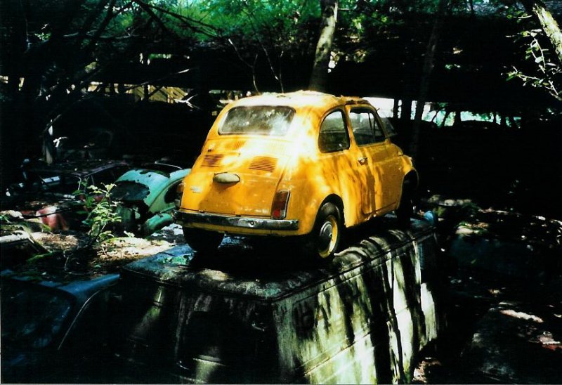 Historischer Autofriedhof Gürbetal, Kaufdorf: Dieser Fiat 500 wirkt beinahe zu neu zu den alten Autos. Er wurde übrigens extra für diese Kulturausstellung mit dem Helikopter in diese Lage platziert! Am 27. Juli 2008