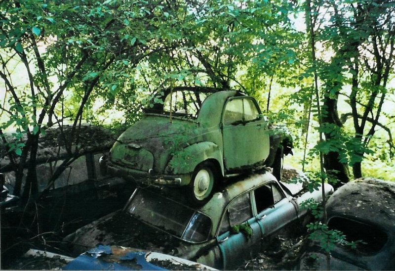 Historischer Autofriedhof Gürbetal, Kaufdorf: Nicht immer sind die Autos schön nebeneinander gestellt; ab und zu türmen sie sich kreuz und quer auf. Am 27. Juli 2008