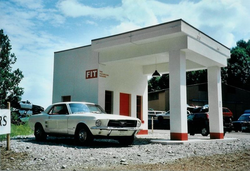 Historischer Autofriedhof Gürbetal, Kaufdorf: Dieser Ford-Mustang steht vor einer FIT (freie internationale tankstelle) Tankstelle am 27. Juli 2008