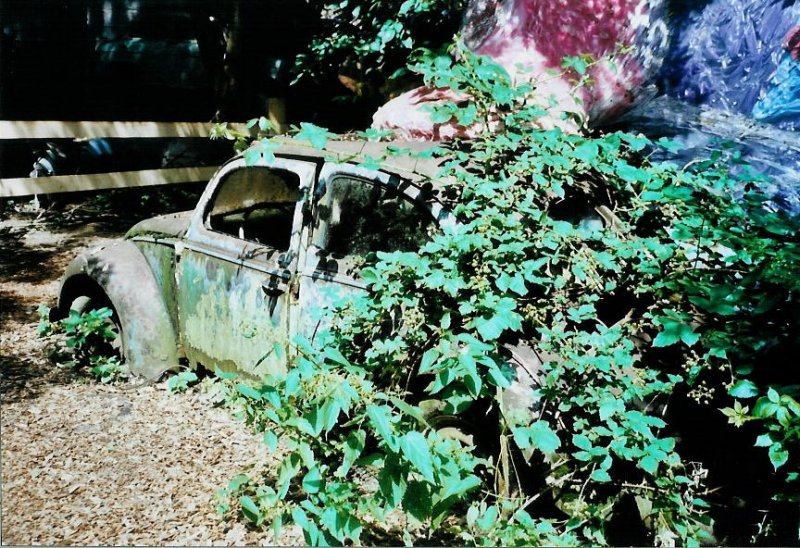 Historischer Autofriedhof Gürbetal, Kaufdorf: Hier ist der VW-Käfer nochmals, jedoch aus dieser Sicht vor dem Gebüsch am 27. Juli 2008