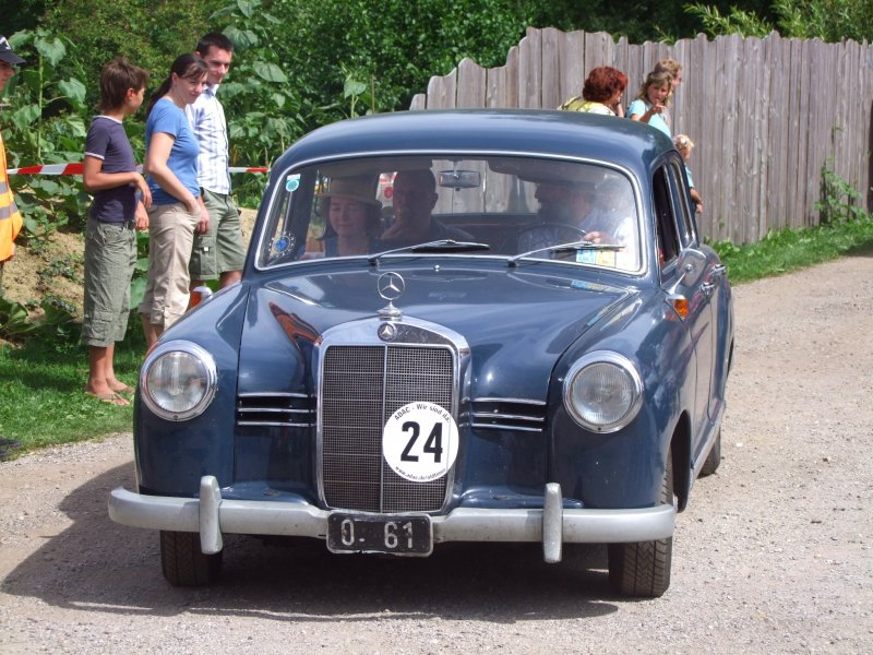 MB 180D mit dem noch altem schwarzen Kennzeichen begibt sich unter bewundernden Blicken auf die OldtimerRundfahrt in Münsteuer; 080810