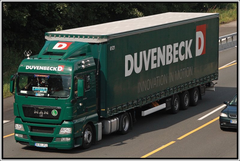An der falschen Stelle gespart? Ein rumänischer MAN TGX 18.390 der DUVENBECK Unternehmensgruppe ist Richtung Süden unterwegs. Für schwere Transporte in den Alpen ist die Zugmaschine nicht die beste wahl..... (21.08.2008)