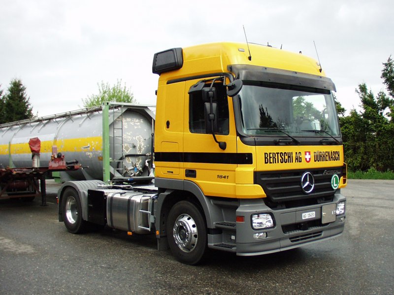 Der erste Actros Mp2 mit EURO 5 als Testfahrzeug für die schweizerische Spedition Bertschi AG Dürrenäsch auf einem Rastplatz in der Zentralschweiz.