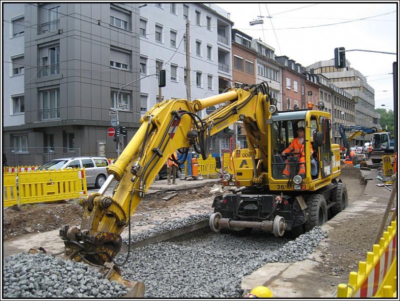 Düsseldorf, U-Bahn-Projekt Wehrhahnlinie, künftiger Haltepunkt Kirchplatz, 17.05.2008: Ein Atlas-Zweiwegebagger der Firma VolkerRail beim Vorbereiten eines neuen Gleisbettes für Straßenbahngleise.