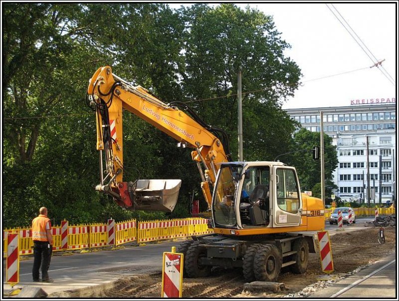 Düsseldorf, U-Bahn-Projekt Wehrhahnlinie, künftiger Haltepunkt Kirchplatz, 17.05.2008: Großkampftag für Bauarbeiter und Bagger wieder einmal in der Elisabethstraße. Am Wochenende 17./18.05. wurden die Straßenbahngleise bei der Haltestelle Kirchplatz verschwenkt, um das Baufeld für den Bau eines unterirdischen Haltepunkts frei zu machen. Ganz vorne im Einsatz ein Atlas-Bagger der Düsseldorfer Baufirma Otto Bach.