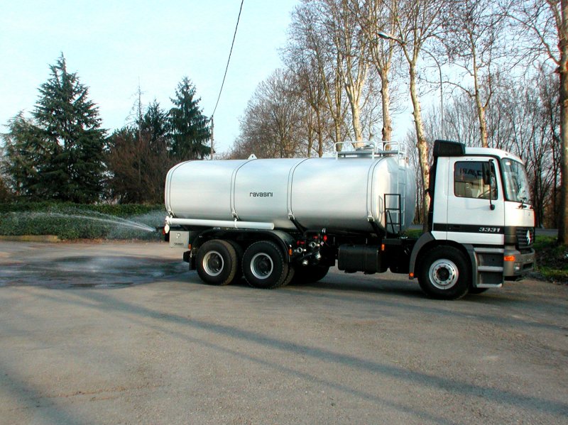 Ein Actros ´97 3331 mit RAVASINI Tankaufbau für Wasser, der später nach Afrika verkauft wurde, versucht in Parma (Italien) seine Wasserspritzanlage aus.