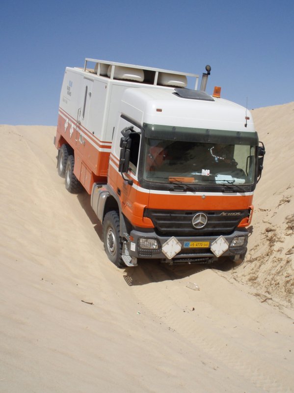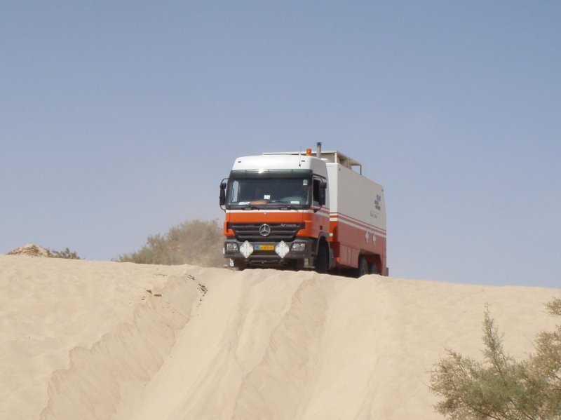 Ein Actros Mp2 3341 der Baker Hughes Gruppe in Zentralafrika in der Wüste.