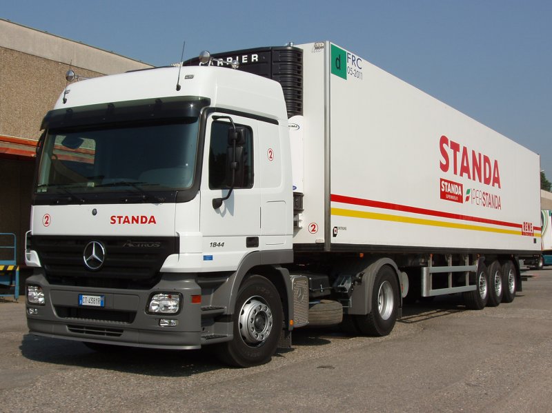 Ein Mercedes-Benz Actros MpII 1844 der italienischen Gruppe Billa Standa auf einem Supermarktparkplatz in Italien.