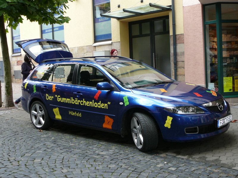Mazda 6 mit Werbung für den Gummibärenladen in 36088 Hünfeld am 23.08.08