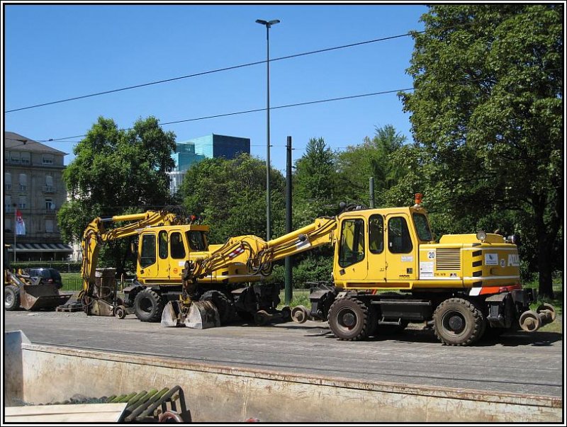 Sicherlich im Zusammenhang mit den zahlreichen Baustellen des U-Bahn-Projekts "Wehrhahnlinie" in Düsseldorf waren am 10.05.2008 diese beiden Atlas-Bagger mit Zweiwege-Ausrüstung an der Straßenbahn-Haltestelle Jan-Wellem-Platz abgestellt.