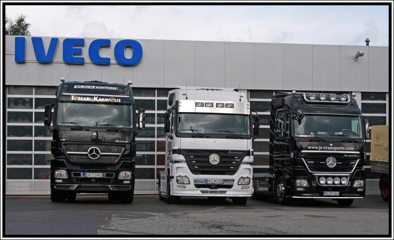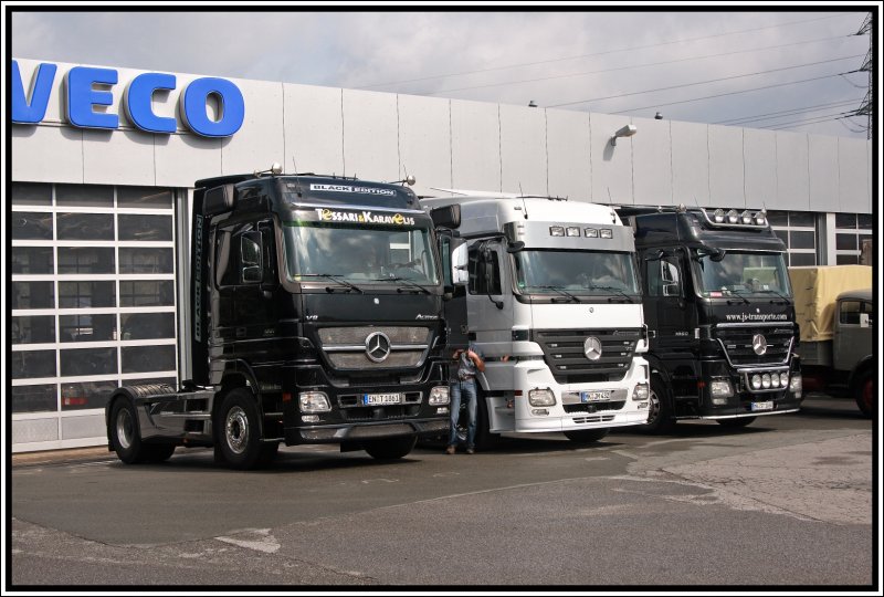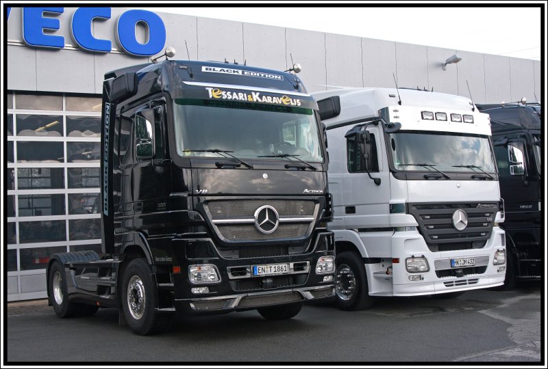 Tessari&Karavelis BlackEdition 1861 (612PS) zeigte sich ebenfalls bei Jürgens in Lüdenscheid. Daneben steht ein Actros (vermutlich 1846) mit V6 Motor. (23.08.2008)