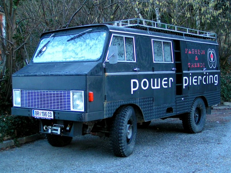 Eigenartiges Fahrzeug mit angebauter Seilwinde und Werbeaufschrift für ein Piercing-Institut steht auf einem Parkplatz im Stadtgebiet Ried i.I.; 080209