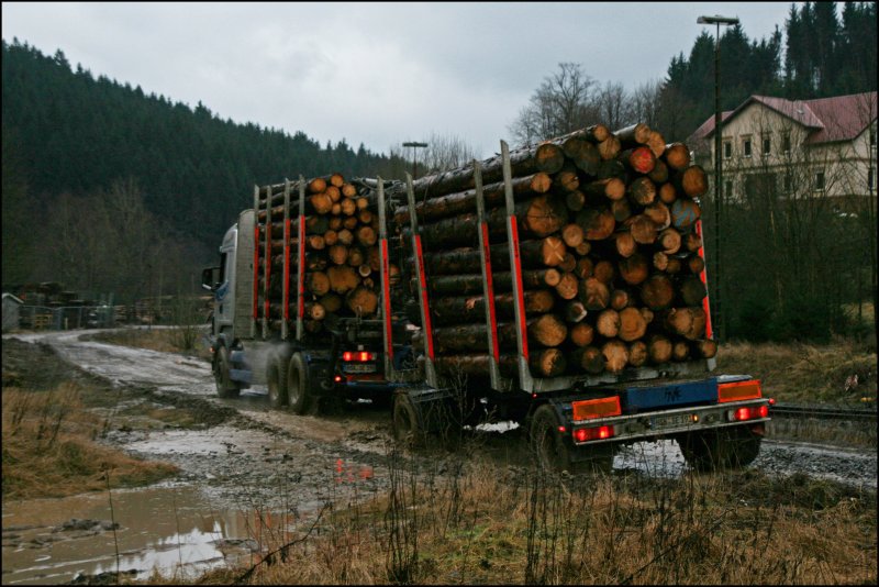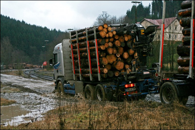 Mercedes-2538 beim Verladen von Fichtenstämmen auf Waggons; 080209