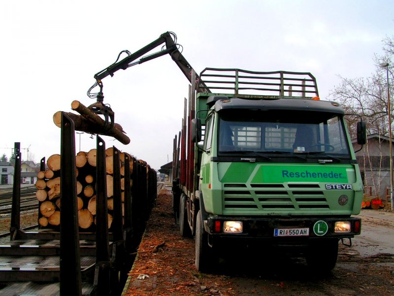STEYR-32S37 beim Verladen von Fichtenstämmen am ehemaligen Viehverladeplatz in Ried i.I.; 080215