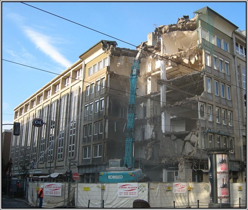 Die gleiche Baustelle in der Düsseldorfer Schadowstraße. Der KOBELCO-Bagger hat das Gebäude am 17.08.2007 bereits weitgehend niedergemacht.