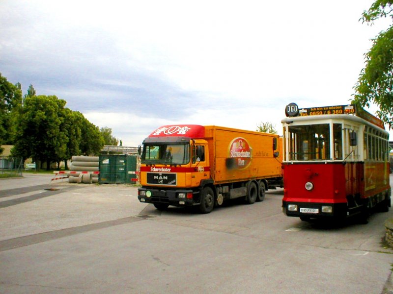 MAN der Schwechater-Brauerei, posiert neben der "Partybim" (2005)